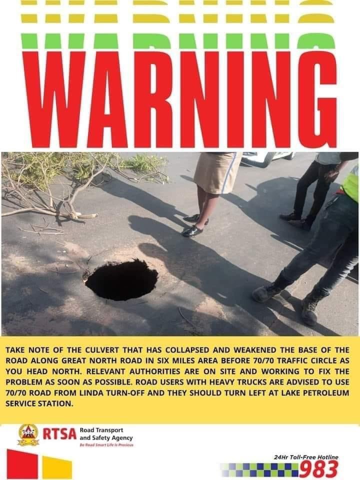 The Road Development Agency (RDA) regrets to advise the travelling public that a sinkhole developed approximately six miles North of Lusaka along the Great North Road around 15:00 hours.