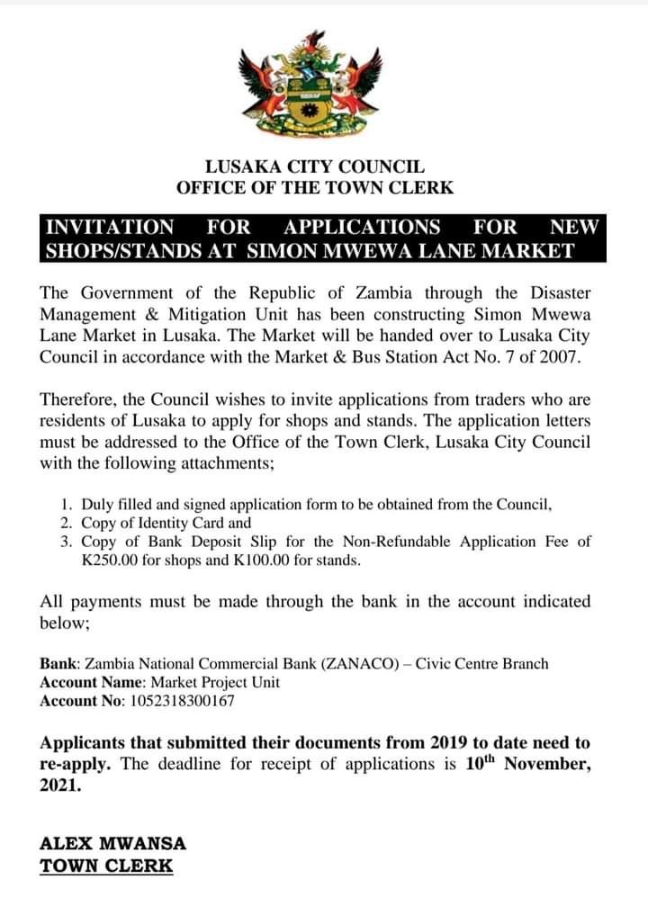THE LUSAKA CITY COUNCIL (LCC) ADVERTISES SHOPS AND STANDS AT SIMON MWEWA LANE MARKET