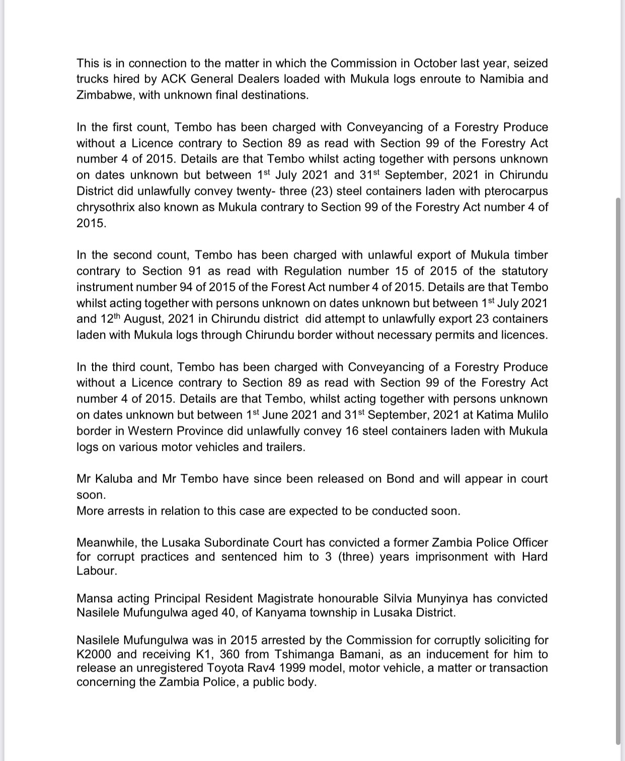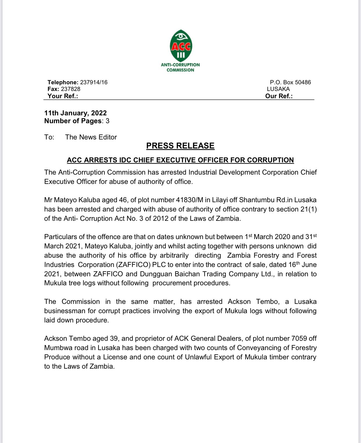 ACC Arrests IDC Chief Executive Officer Mateyo Kaluba for abuse of authority, warns and cautions Former Lusaka minister Bowman Lusambo in an undisclosed matter