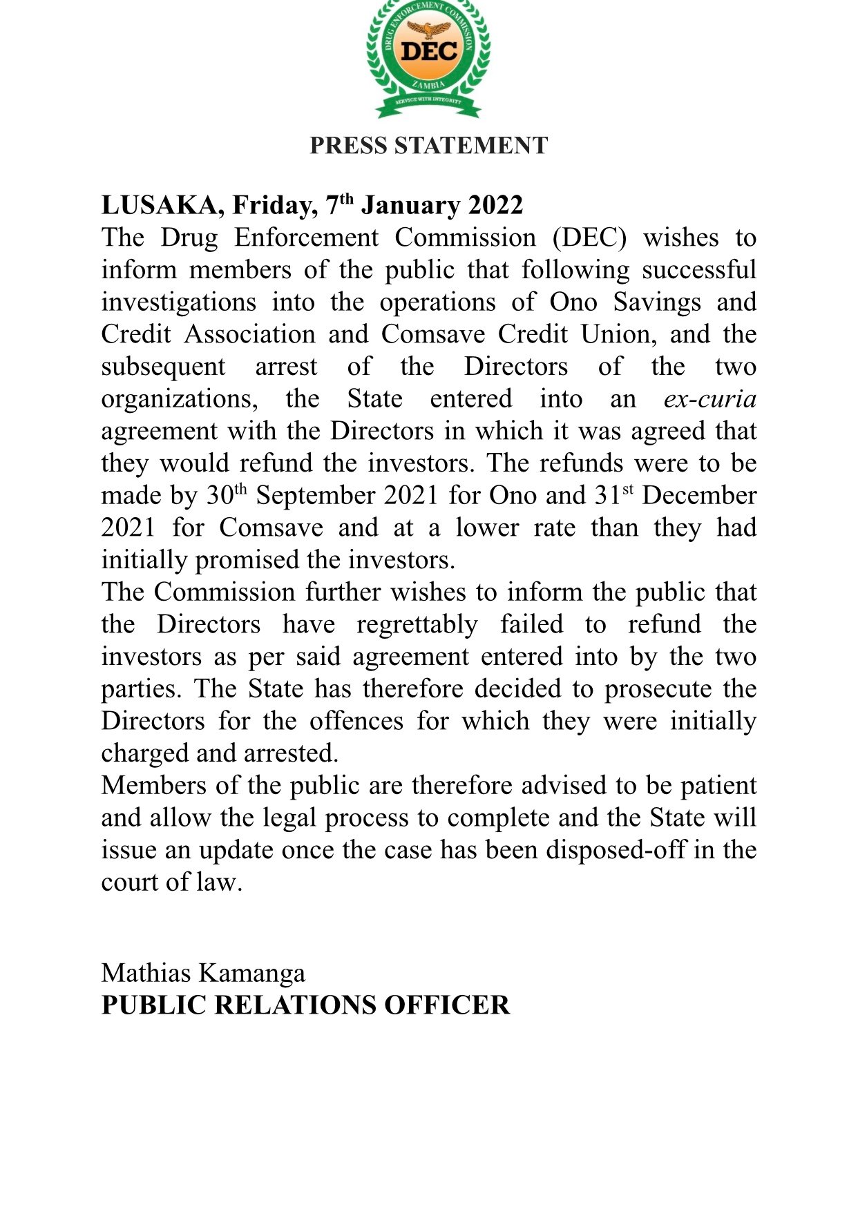 DEC to prosecute directors of Ono Savings Credit Association, Comsave after failing to fufil conditions of an ex-curia agreement entered into with the state in which the directors agreed to refund investors