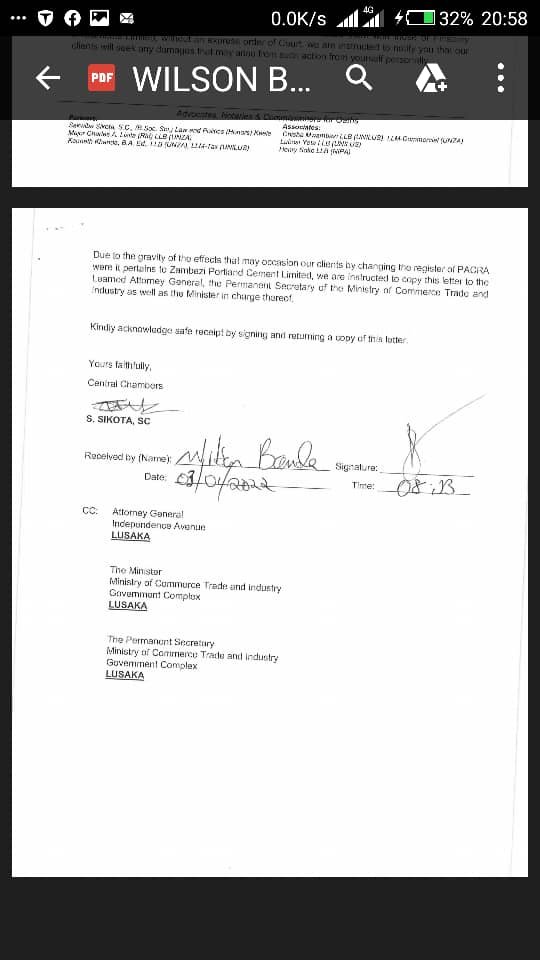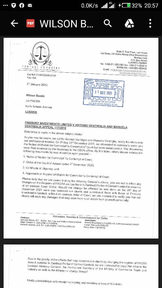 According to a letter from the Ventiglia family lawyers, Central Chambers to the PACRA Registrar, details on the register of Zambezi Portland Cement (ZPC) have been changed.