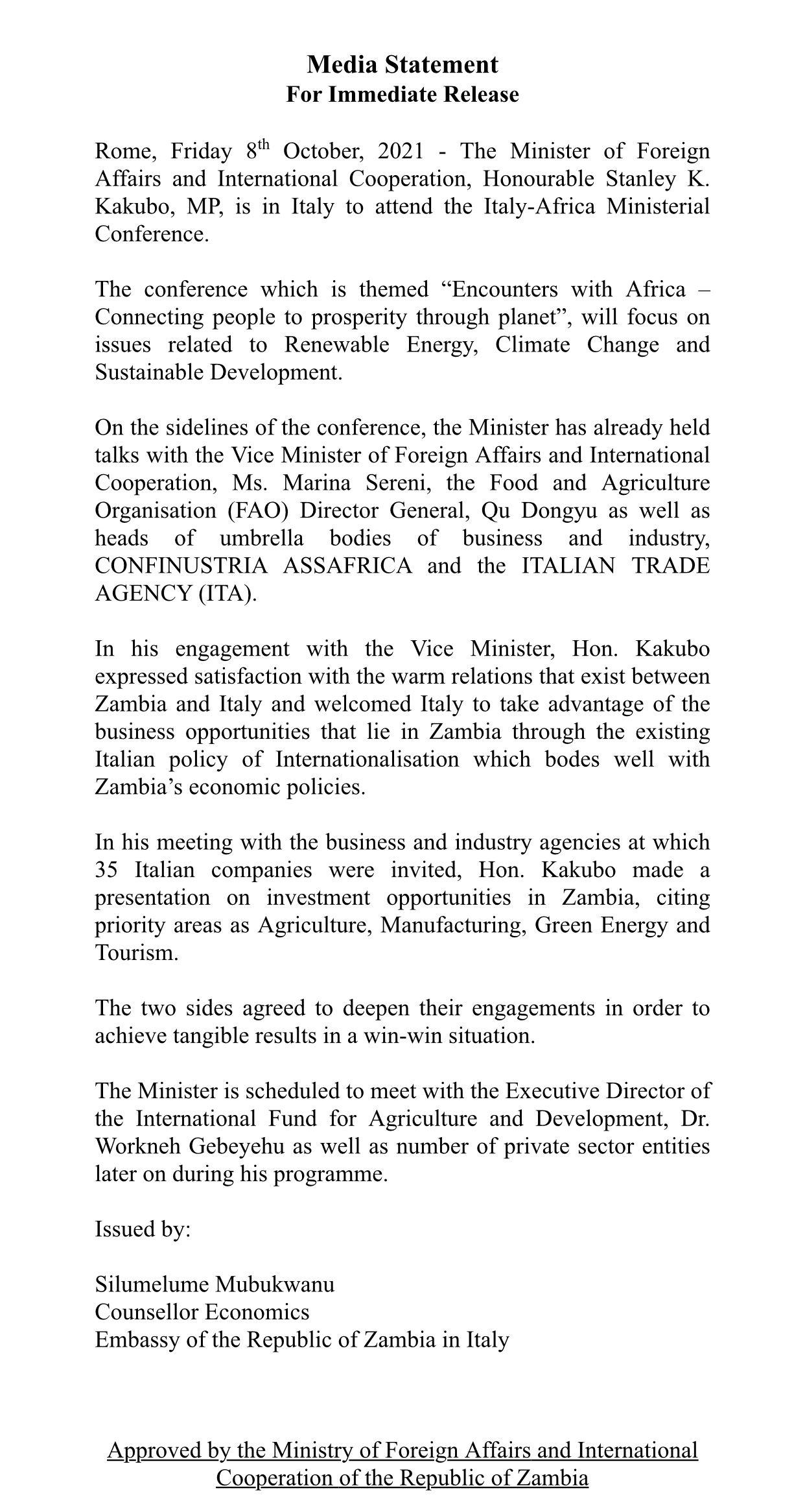 Breaking NewsNewsMinister of Foreign Affairs and International Relations Stanely Kakubo expected in Italy for the Italy- Africa Ministerial Conference. Last updated: October 8, 2021 5:27 pm Daily Nation Share 0 Min Read SHARE To continue reading, you must subscribe to either DAILY, WEEKLY or MONTHLY Plans.You Might Also Like Parents urged to send children to school or else… ‘Find solution to Black Mountain riots’ Malanji is just a scapegoat, ECL is the real target-Mpombo Austerity measure extended to foreign travels for government officials Chamber of Commerce wants tax reforms expeditedSign Up For Daily NewsletterBe keep up! Get the latest breaking news delivered straight to your inbox.By signing up, you agree to our Terms of Use and acknowledge the data practices in our Privacy Policy. You may unsubscribe at any time. Share This Article Facebook Copy Link Print Previous Article UPND BANS MEALIE MEAL TRADERS Next Article K82M LOST Stay Connected235.3kFollowersLike69.1kFollowersFollow56.4kFollowersFollow4.4kFollowersFollow - Advertisement -Latest News Nevers sued for illegally holding on to MMD presidency Local News Tie Business March 21, 2025 Court orders trial within trial in attempts to bewitch HH Community Court News March 21, 2025 SNV launches 7.4M Euros youth employment, entrepreneurship project Community Local News March 21, 2025 RDAZ sued for barring 2 doctors from partaking in upcoming elections Africa Court News March 21, 2025