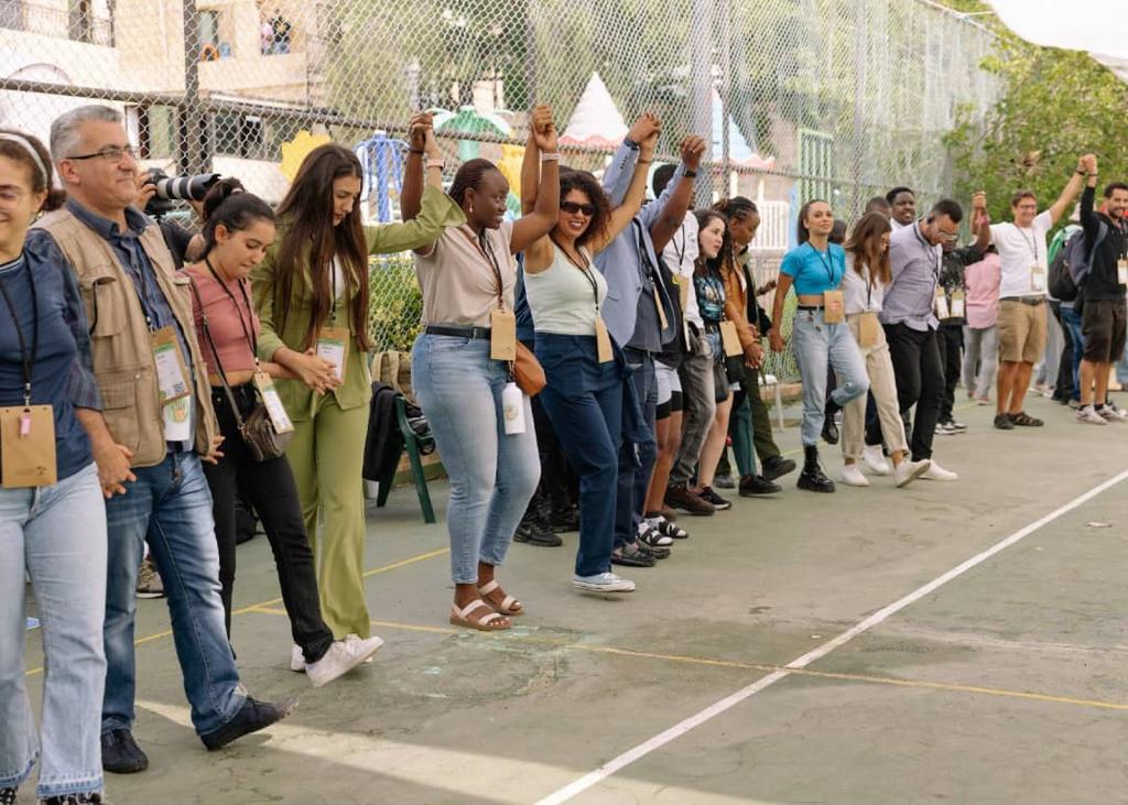 Participants from different countries during an energiser at the climate justice camp. Picture by Marie Jacquemin